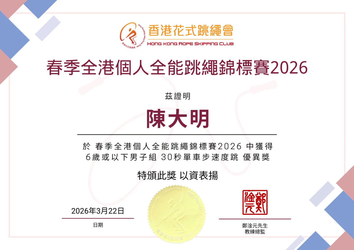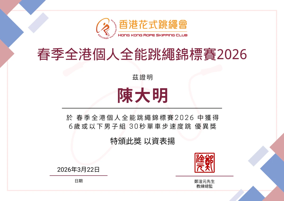 | 得獎證書 | 各單項頭十名及個人總成績頭八名 | 實體版$120/張 電子版$80/張 |